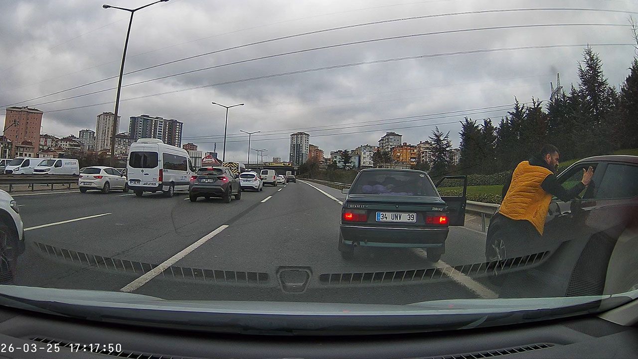Önündeki kamyon nedeniyle sağ şeride geçemeyen 34 UNV 39 plakalı araç, sinirlenerek Nissan markalı araca şişe fırlatarak emniyet şeridine sıkıştırdı. Sıkıştırdığı aracın önüne kıran öfkeli sürücü, otomobilinden inerek 34 ELC 191 plakalı araç sürücüsüne tokat attı. Kavga nedeniyle sağ şeritte araçlar birikirken, sürücüler yaşanan olaya korna çalarak tepki gösterdi. Araçların ısrarlı uyarısı ve bir motosiklet sürücüsünün müdahalesinin ardından öfkeli sürücü olay yerinden güçlükle ayrıldı.
